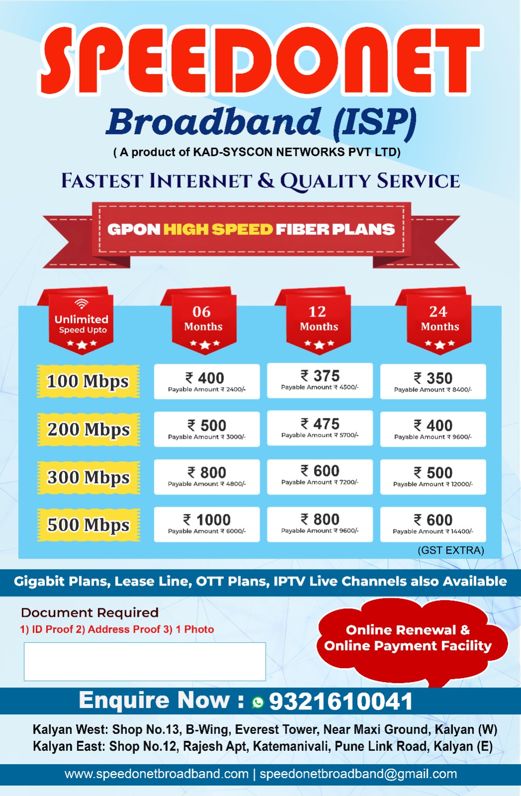 Payable Amount ₹ 12000/-Speedonet is committed to providing reliable, high-speed internet services with transparent pricing and responsive customer support. Below are answers to some of the most commonly asked questions to help you understand our plans, services, and support process better.