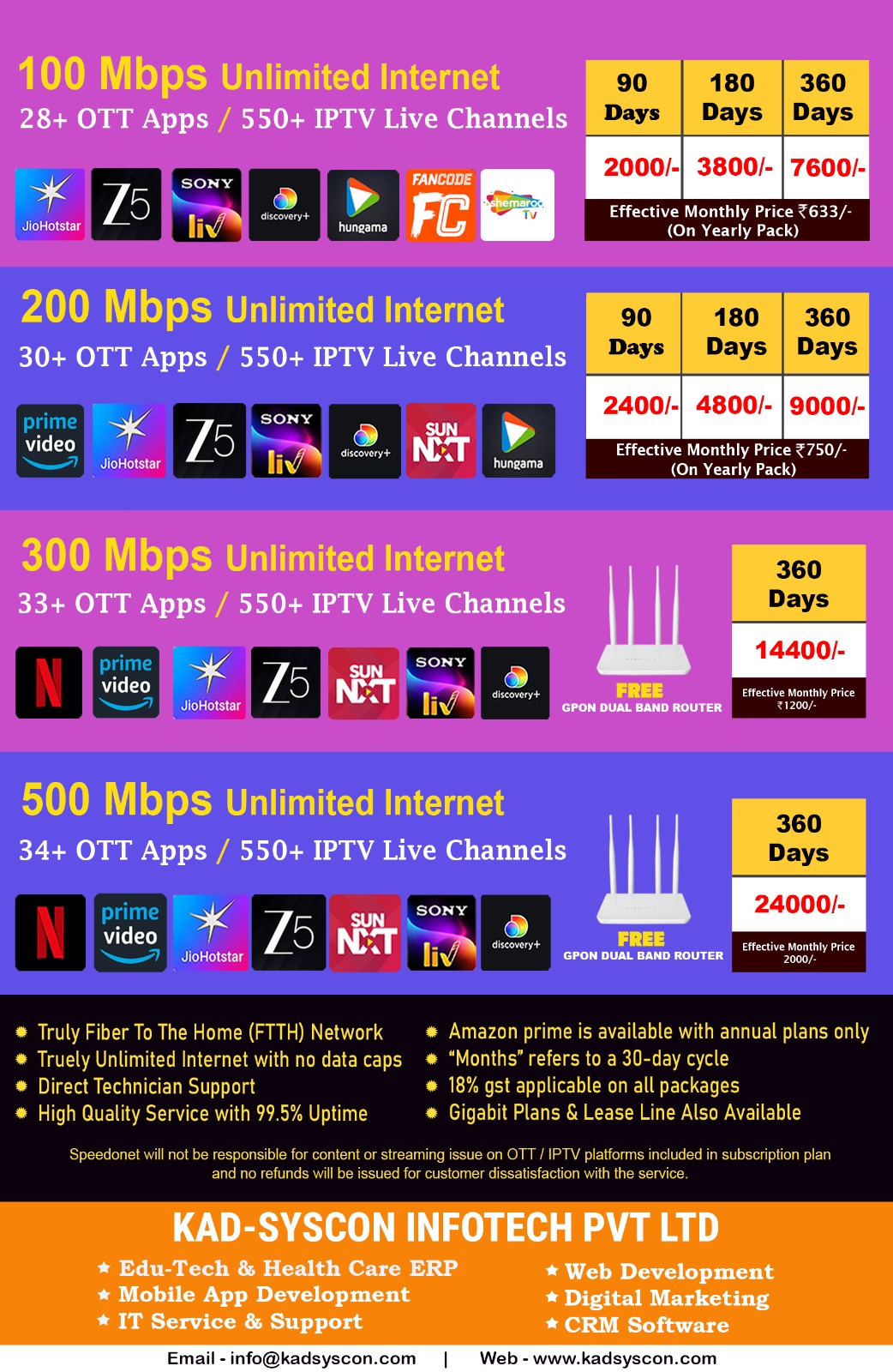 | 200 Mbps | Prime Video, JioHotstar, ZEE5, Sony LIV, Discovery+, Sun NXT | ₹2400 | ₹4800 | ₹9000 | ₹750 |
